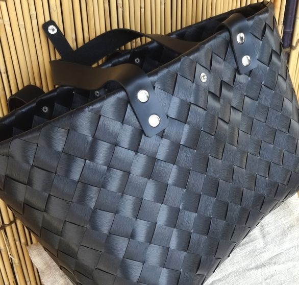 こちらは編み方が通常よりも1つ多い、2重で編まれた丈夫な作りの商品です。 ハンドルにはレザーが用いられ、落ち着いた色合いに仕上がっています。 丈夫で水にも強く大容量ですので、買い物やレジャー等の普段使いに活躍してくれます。 |
