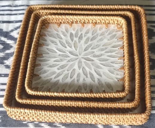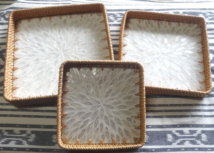 | 商品説明 | ベトナムでハンドメイドされているキッチントレイです。 真珠貝の螺鈿装飾を施された木製のプレートに東南アジアに自生する「グォット」と呼ばれる植物の繊維を編んで作ったトレイ。 豊かな色彩に反射する真珠貝の鮮やかな光沢が、上品で特別な存在感を生んでいます。 3つの異なるサイズが1セットになっていて、用途によって使い分けられます。 大・中・小 3サイズのセットでお届けします。 きれいに重なりますので、収納にも場所を取りません。 |