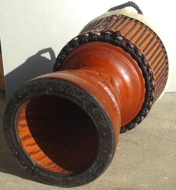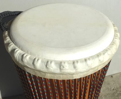 | 材 質 | 胴体:マホガニー、ヘッド:ヤギ皮(厚め)、鉄リング(2本)、ナイロンロープ、ラバーボトム。 |