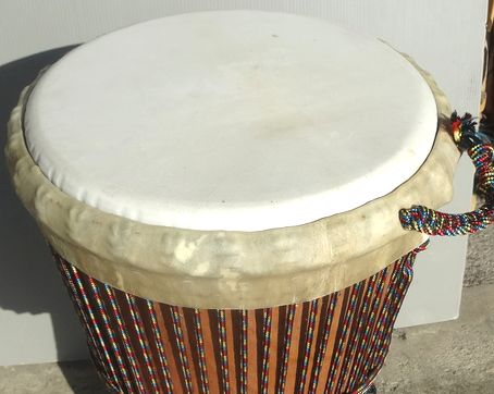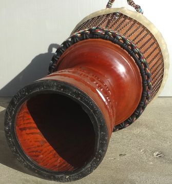 | 材 質 | 胴体:マホガニー、ヘッド:ヤギ皮(厚め)、鉄リング(2本)、ナイロンロープ、ラバーボトム。 |