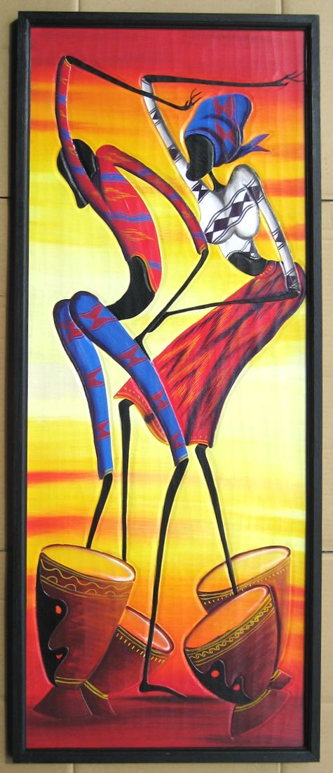 木製のキャンバスに彫刻をした後、鮮やかにペインティングされたアフリカン・アートです。